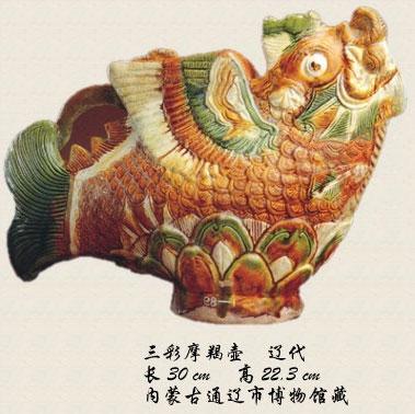 再有就是摩羯鱼壶。摩羯鱼,反映的是鱼化龙的瞬间,脑袋已经变成龙头,身子还是鱼尾巴。佛家认为它有护法的作用,能驱凶辟邪。摩羯鱼壶是辽代瓷器中极为特殊的一种,过去都说它价值连城。北京故宫有一件,被定为一级文物。