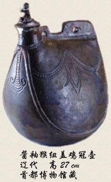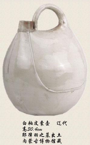 辽代最典型的器皿都是什么呢?辽代独有的瓷器首推鸡冠壶。这种壶上面有一块像鸡冠子,非常形象,有黑的、黄的、绿的。鸡冠壶由皮囊壶演化而来,模仿皮囊的样子。这种造型就不是陶瓷的正常造型,陶瓷最容易做的就是圆器,把陶瓷做成这种扁扁的样子,不是很容易的事。但是,皮囊壶有一种民族感情在里面。辽代最早都是用金属器和皮革器,辽人从小使这个,祖上传下来的就是这个,所以尽管换了材料,也还要做成这个样子。这是辽人文化上的追求,完全是文化的力量,这一点很重要。