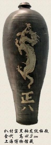 过去对金代瓷器不做研究,根本不说金瓷,就说宋瓷。当时把很多北方金代时期的瓷器都叫宋瓷,今天则分得比较清楚,把金政权辖区内的瓷器彻底分出来。金人跟辽人不一样,金人几乎没有自己独创的瓷器,就是走到哪儿使到哪儿,使用汉族人的东西很高兴,自己不创造。今天看很多汉族的瓷器,无非就是在金代政权辖区之内生产的。比如上海博物馆所藏的梅瓶,画着一只龙往天上爬,龙下面写"正八"。"正八"两个字一开始很多人解释不清楚,是不是"王八"两个字写错了?其实"正八"就是佛教中的"天龙八部",也称"正八部"。由此而证明这件梅瓶过去是在寺院中所使用的。