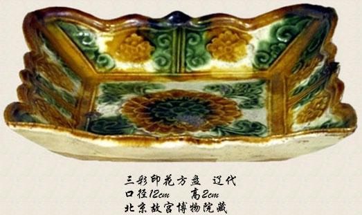 辽代瓷器中有三彩器。宋代也有三彩,受唐三彩影响。辽三彩跟宋三彩之间,可能相互都有影响。辽代瓷器中还有一种很特殊的瓷器,方盘,方形的盘子。瓷器一般都是圆的,上转盘一拉就圆了,方的反而不好做。那辽瓷为什么做成方的呢?因为辽在历史上都是用木头盘,木头做成圆的麻烦,做成方的简单。所以当用陶瓷做的时候,还是沿袭旧制,也做成方的了。