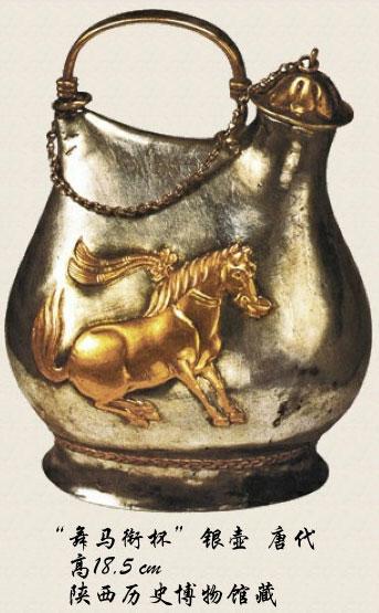 每年八月五日是唐玄宗的生日,都有各种表演。其中一个重要表演,就是"舞马衔杯"。让马衔着酒杯,一直递到皇上跟前。这个场面我们今天都不能想象,只能靠文物给我们提示。比如陕西何家村窖藏出土的银鎏金舞马衔杯酒壶,非常精美漂亮。那个壶上的马,就反映了唐玄宗过生日的一个场面。