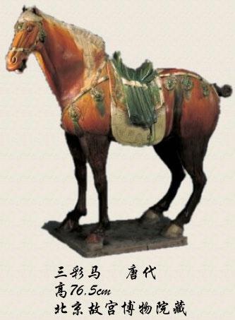 唐三彩里有很多马非常生动,非常漂亮,都是贵族的马。那么我们注意马的动态,比如有一匹非常著名的马叫"左勾头,右抬蹄",就是向左勾着头,抬着前腿,非常具有动态。后来我就想,过去对模特的要求也是向左边拧着头,耸着右肩,都是一样的。这样塑造出来的动态,其实不怎么舒服。李白有一首非常著名的诗《将进酒》:"五花马,千金裘,呼儿将出换美酒,与尔同销万古愁。""五花马",古书上的解释也非常多,就是一种非常名贵的马。所谓"花",大概是指马脖子这个位置的装饰,非常漂亮。"五花"当然也是一个泛指。