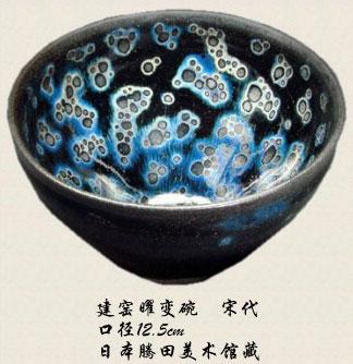 日本有一件著名的建窑,纹理特别奇怪,既不是油滴,也不是玳瑁,它叫"曜变天目茶碗",视为国宝。