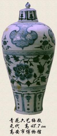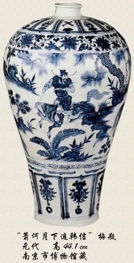再有就是建国初期,南京沐英墓出土了一件非常著名的元青花,"萧何月下追韩信"梅瓶,人物纹的元青花梅瓶,重要的国宝,现藏于南京市博物馆。