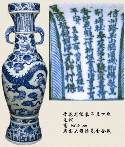 元青花的研究,历史上没有人做过,所以元青花在史籍上无载。第一个研究元青花的是个美国人,叫波普,他在20世纪50年代才开始研究,最早研究的元青花瓷器是一对龙纹象耳大瓶。这对大瓶是英国人霍布逊1929年在北京发现,买下后运往欧洲的。这对大瓶上有确切的文字记载,上写:"信州路玉山县顺城乡德教里荆塘社,奉圣弟子张文进喜拾香炉、花瓶一副,祈保合家清吉,子女平安。至正十一年四月,良辰谨记。"瓷器上写得很清楚,至正十一年,就是公元1351年,一个叫张文进的人花钱定的瓷器供九九藏书奉。这对元青花大瓶至今收藏在英国大维德基金会,去伦敦的时候可以看到它的展出。而香炉还没找着呢,大家可以去找找。一般情况寺庙里的摆放是香炉搁在中间,大瓶一边一个。大瓶发现了,香炉至今还没找着。
