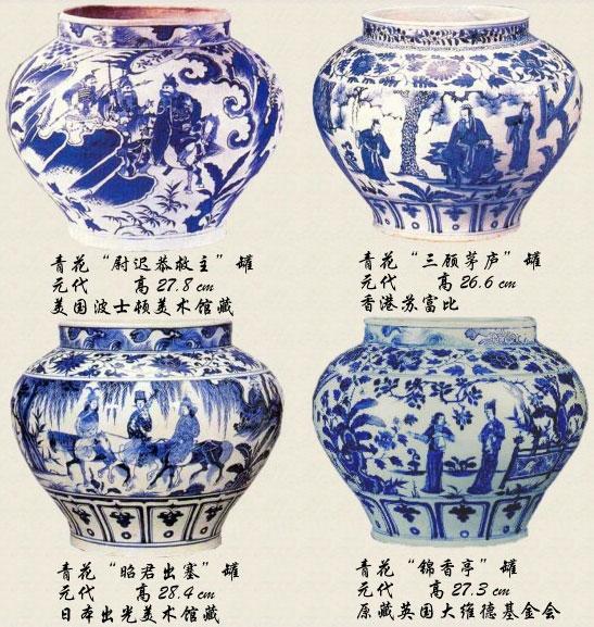 画有人物纹的元代青花罐非常罕见,全世界不足十个,分别藏在博物馆和私人手里。主要有东京出光美术馆藏的"昭君出塞"青花罐、美国波士顿美术馆藏的"尉迟恭救主"青花罐、日本大阪万野美术馆藏的"百花亭"青花罐、英国铁路基金会藏的"锦香亭"青花罐、苏富比在1996年拍卖的"三顾茅庐"青花罐,还有"西厢记"、"细柳营"两个青花罐,都为私人收藏。这么大的画人物的罐子,全世界就这点儿,所以就变得非常贵。