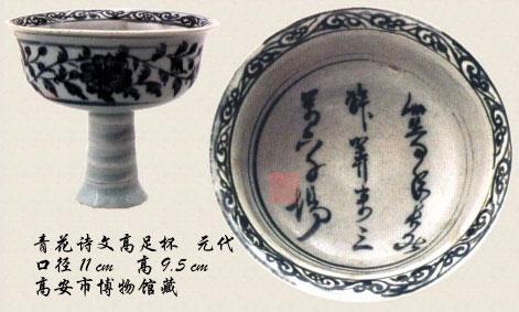 比如高安出土元青花中有一个把杯,所谓把杯就是高足杯。这样的就是把杯,喝酒用的。我们现在的酒杯都很小了,它这个酒杯很大,底下一攥。为什么酒杯做成这样呢?过去他是马上民族。他骑在马上,一只手腾出来就可以攥住这个杯子。"欲饮琵琶马上催"就是这个感觉。