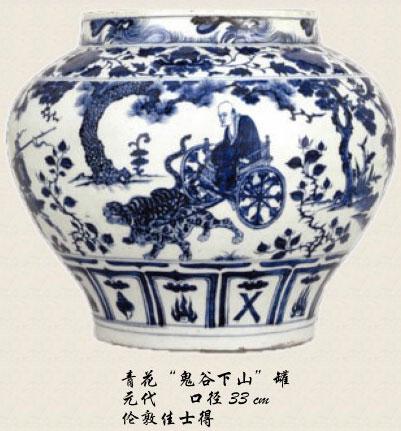 第二,元青花开中国陶瓷装饰的一个先河。在它之前,瓷器的装饰都不这么强烈。鬼谷下山罐的颜色、画艺、质量,今天看都是登峰造极的水准,永不过时。