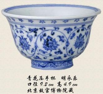 永乐官窑近年在景德镇珠山大量出土,珠山就是当时御窑厂的所在地。永乐瓷器中最负盛名的压手杯,反而未见出土。先解释一下压手杯,碗形,大小搁在虎口的位置上正好。由于胎比较厚,分量比较重,有沉重感,所以叫"压手杯"。带有确切"永乐年制"款的永乐青花压手杯,全世界只有3件。我前些年在江苏电视台做节目,现场有很多观众拿来东西鉴定。有个人拿了一件青花压手杯上来了。我跟他说:"全世界带有年款的压手杯,仅有三个是真的,你这是第四个。"
