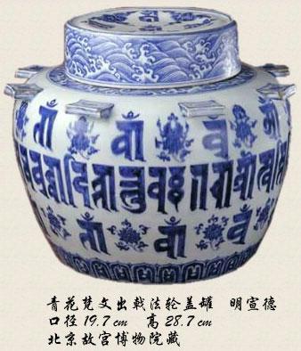 宣德在位10年,38岁的时候去世。他在位时是明朝的盛世。宣德皇帝雅好艺术,喜欢绘画,大名鼎鼎的宣德炉就是这个时期的产物。因为有雅好艺术的宣德皇帝,才有了宣德瓷器的辉煌成就。乾隆皇帝就非常欣赏宣德瓷器。比如有一件极为特殊的青花瓷器,是御用的礼器,佛教做道场的时候使用,瓷器上面写着古印度的梵文,还有五个汉字"大德吉祥场",意思是能够消灾去难,吉祥如意。乾隆皇帝非常喜欢这件宣德青花,他让宫廷画师丁观鹏画了一幅《鉴古图》,把这件宣德青花画在图上,搁在自己身旁,表明他对这件东西的酷爱。